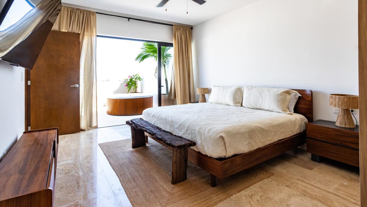 Upstairs, the private bedroom features a king bed, generous storage, a full bathroom, and a second 75-inch TV. Step up again to your private rooftop terrace with a hot or cool jacuzzi and ocean views, ideal for a relaxed, open-air finish to the day.