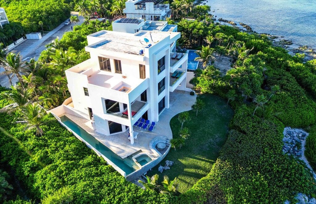 Outdoors, the seaside pool, terraces, and landscaped grounds flow seamlessly toward the Caribbean, creating panoramic blue-water viewpoints from every upper level. The architecture marries crisp contemporary lines with warm, organic Mexican elements: chukum finishes, handcrafted textures, and an artful collection of original Mexican and international works that elevate the home’s character and soul.