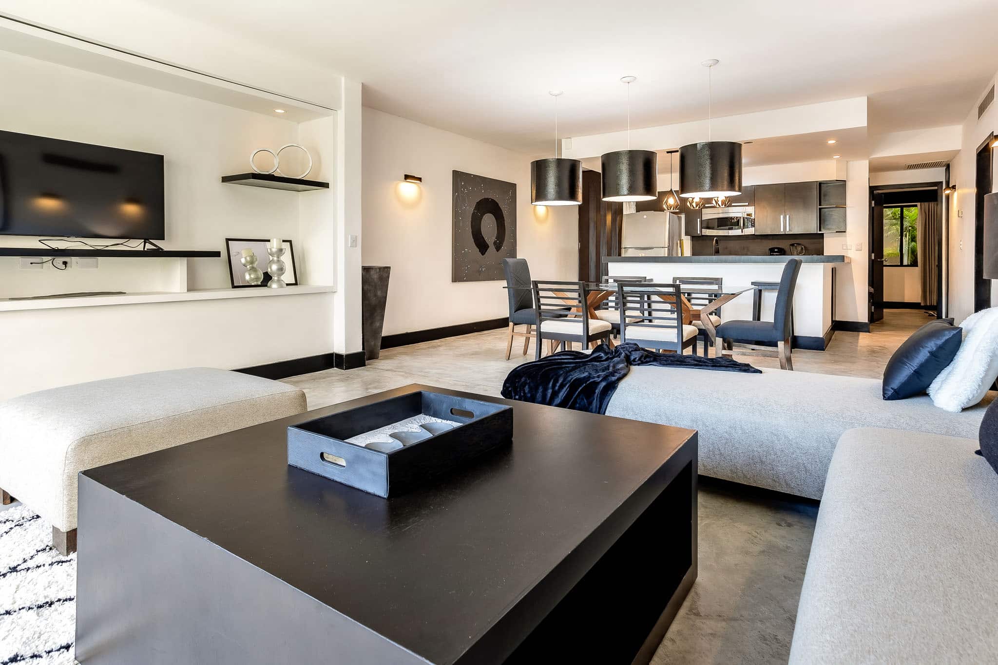 The open-concept living space flows seamlessly into a fully equipped, modern kitchen adorned with sleek marble finishes and stainless steel appliances. This kitchen offers both luxury and function, perfectly suited for preparing meals after a day at the nearby Mamitas Beach Club.