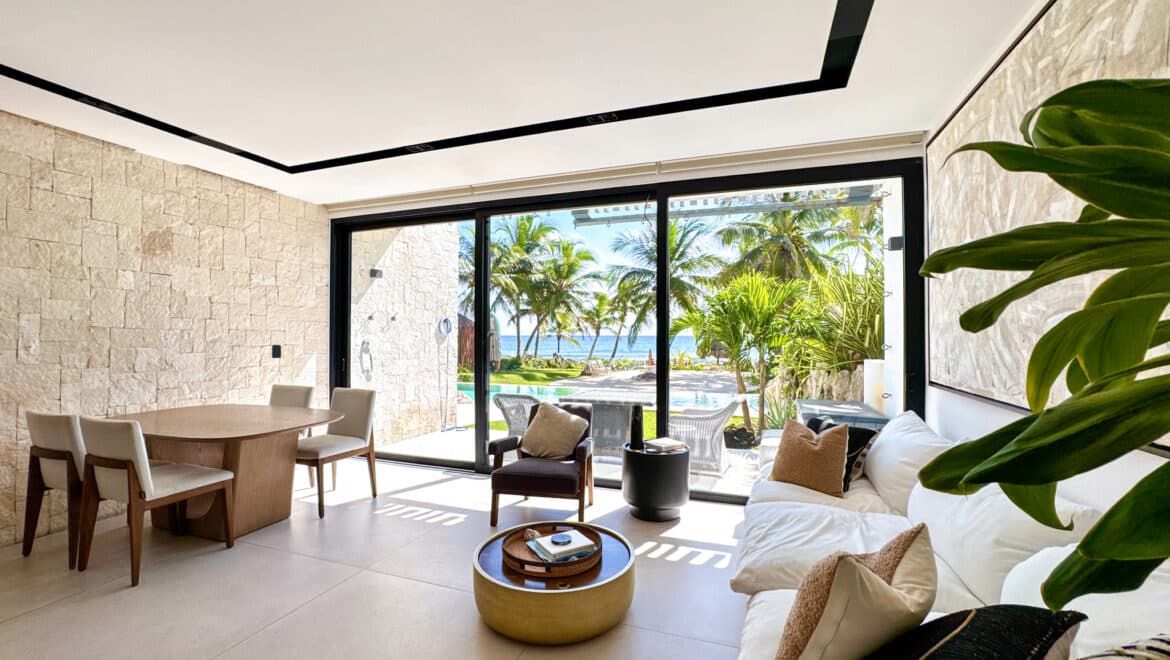 Set in Puerto Aventuras, this beachfront residence at CasaCún pairs the privacy and feel of a villa with the simplicity and security of a boutique condominium. Positioned between the Caribbean Sea and a calm lagoon, it offers uninterrupted water views, direct beach access, and a rare connection to both open-water horizons and protected, swimmable shoreline.