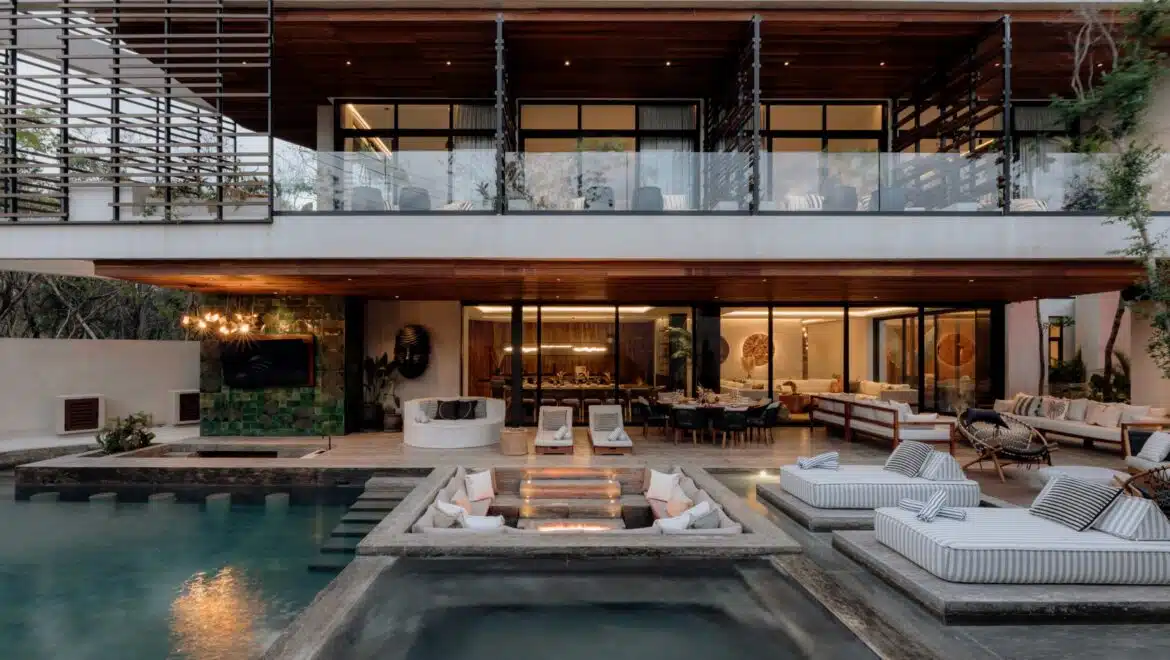The estate’s outdoor environment is a private retreat unto itself, offering an atmosphere reminiscent of an exclusive boutique resort. Centered around a spectacular swimming pool, the garden features a swim-up bar, integrated jacuzzi, and a captivating architectural waterfall that elevates both ambiance and design. Multiple sun terraces, shaded lounge areas, and outdoor dining zones create a variety of environments for relaxation, entertainment, and refined alfresco living. Clear sightlines and lush tropical landscaping capture the essence of Tulum’s natural beauty, while preserving a sense of expansiveness and privacy.