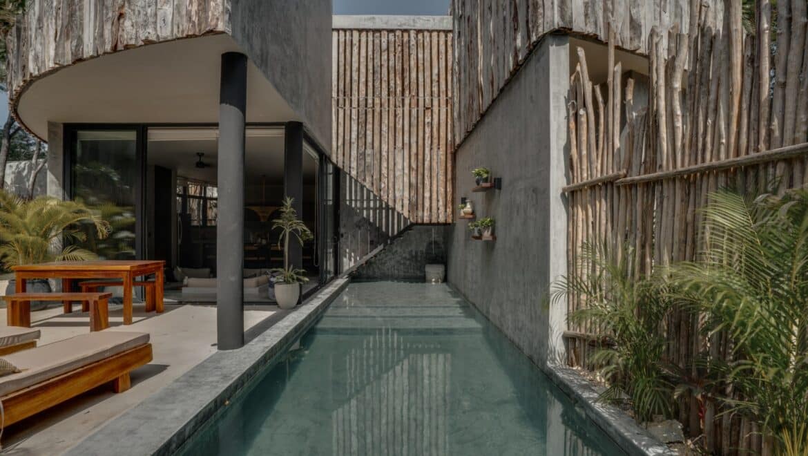Tucked within the jungle landscape just outside the center of Tulum, this architecturally distinctive three-bedroom residence offers a private, design-forward living experience that blends indoor comfort with natural surroundings. Positioned within a secure gated community with 24-hour access, the home is reached by a short walk through lush greenery, creating a sense of separation and privacy from the moment you arrive.