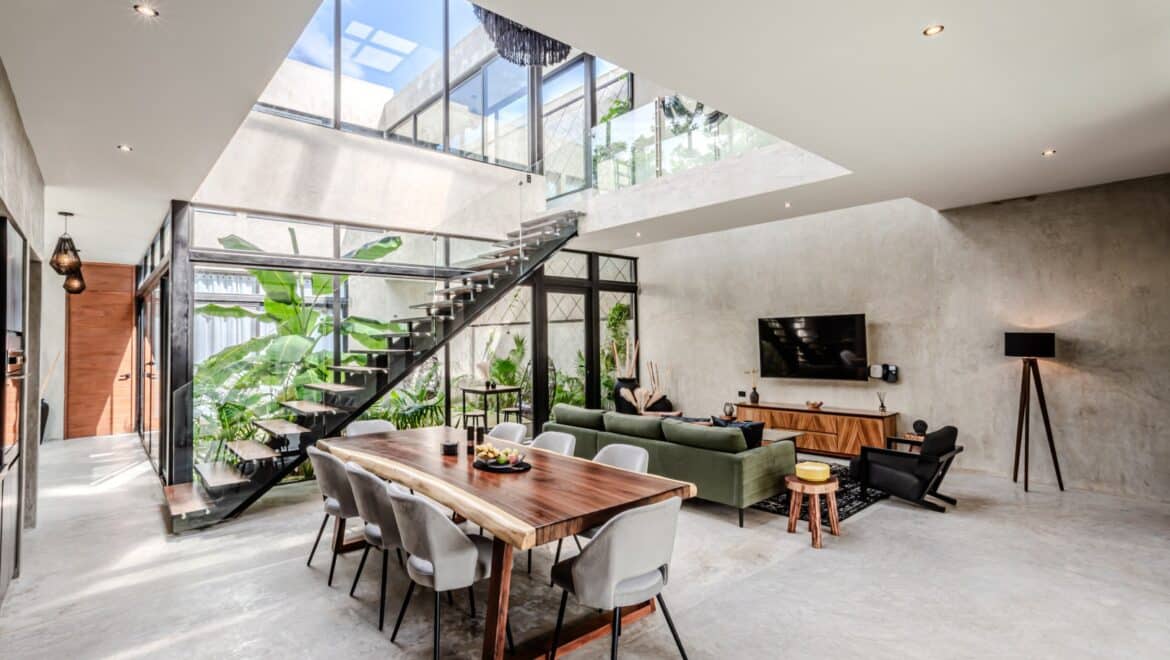 Thoughtfully crafted with attention to proportion, light, and texture, the villa features double-height living spaces, walls of glass, and interior courtyards that create a constant dialogue between indoors and outdoors. Polished concrete surfaces, carved local stone, and rich tropical woods add warmth and depth to the minimalist aesthetic. Every detail is designed to feel natural, intentional, and timeless.